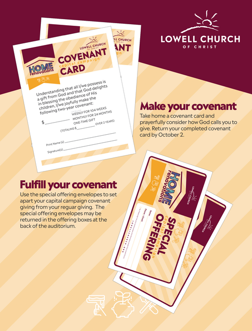 - In the fellowship hall there will be a physical Home Renovations project hub where you can see some details about the projects and get a covenant card. On that card, there will be a place where you can mark how you believe the Lord is leading you to covenant with us toward the Home Renovations Project. The elders ask that each family in the congregation prayerfully consider in what ways God has enabled you to contribute to the Home Renovations Project. By October 5, we ask that covenant pledge cards be turned in to one of the offering boxes at the back of the sanctuary. These covenant pledges will be completely private. No one on the church leadership team will know what you write down. The only persons who will see your pledge amount are: You, the Lord, and Randy Mass, the church’s financial secretary.